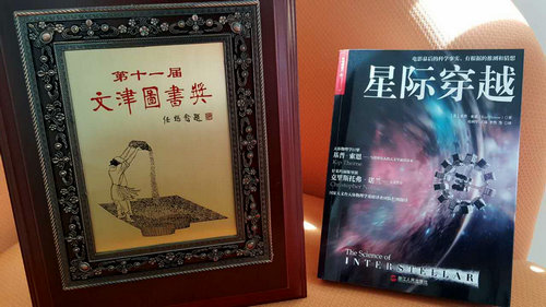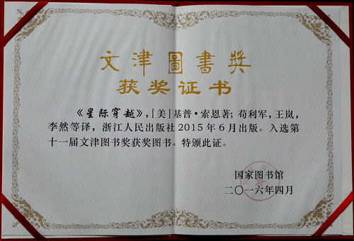 4月23日是第二十一个世界读书日,第十一届文津图书奖在国家图书馆揭晓。在入围的1500余种图书中,最终确定了10种获奖图书及57种推荐图书。《星际穿越》也位列10本获奖图书之一,它是由国家天文台研究人员苟利军、王岚、李然,王乔,王杰,尔欣中,李楠,谢利智(后三位为前国家天文台人员)等人共同翻译。