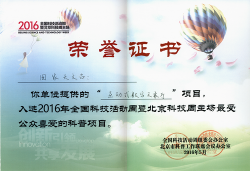 5月14日至21日,由国家天文台、梧台科技发展有限公司、华中师范大学、北京工业大学、北京天文馆共同开发的“中国虚拟天文台万维互动式数字天象厅”首次亮相2016年全国科技活动周北京科技周主场,成为最受公众喜爱的科普项目之一。