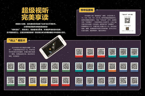 全书装帧和图片非常精美,有很强的视觉冲击。最与众不同的是它的“视听”性,书中藏有30多段珍稀的天文纪录片,用手机扫描二维码后,宇宙中的种种奇观即可逐一呈现,带给读者全新的阅读体验。另外书中还有6幅3D“增强现实”画面,用手机下载“飞向太空”APP后即可进入互动环节,置身浩瀚的太空世界。