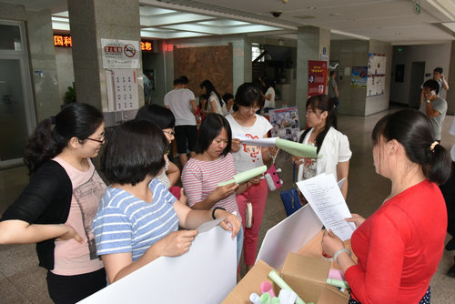 6月3日,开展了环保知识问答活动。活动采取随机抽取题目,现场限时回答的形式,吸引了台内的职工和学生,大家跃跃欲试,活动现场气氛热烈。很多平时并不引人注意的环保小常识让大家惊诧感概:做一层电梯的电可以持续点亮25小时的灯泡;人工色素的来源竟是煤焦油;冰箱空间使用80%是最合理节能的等等。通过这些环保知识互动,进一步增强了大家的环保意识。