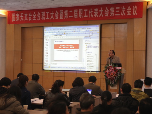 3月15日,国家天文台职工大会暨职工代表大会第二届三次会议在台多功能厅召开。近250位职工参加了全台职工大会。大会由台党委书记刘晓群主持,台长严俊首先传达了白春礼院长在2012年院工作会议上的讲话精神,并介绍了《台长任期目标》。在严台长的《2011年全台工作报告》中,对全台亮点工作、科研进展及成果、经费使用以及党群工作等各方面进行了全面总结,对院和我台“一三五”规划做了详细地阐述。会上,工程项目处处长包曙东进行了全台保密教育。