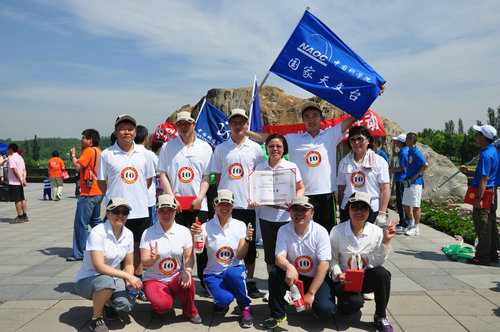 国家天文台经过认真筹划准备,派出5男5女共10人组成的精英队代表国家天文台参加了本次比赛,其中包含4名研究员。上午9点整,随着发令枪响,在蓝色台旗的带领下,队员们如离弦之箭,在纷繁的队伍中脱颖而出,一路领先。快的带慢的,缓的跟疾的,或互相加油打气,或调节一下气氛。10人的队伍始终保持着队形,斗志昂扬;与天空一色的台旗高高飘扬,美丽而夺目。
