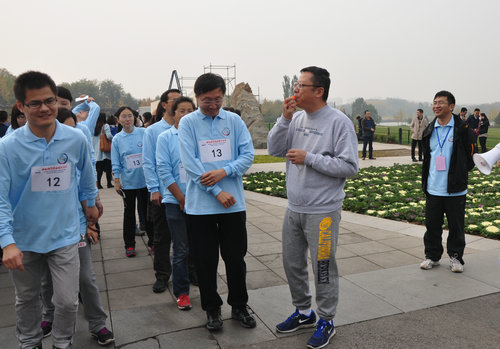 下午2点,13支队伍的130名运动员统一穿着蓝色T恤,被编入1号至13号队伍,在森林公园南门集合。国家天文台工会主席郑晓年为参赛队伍加油鼓劲,希望大家在走路中收获快乐,获得健康。工会副主席陆烨重申了比赛规则,要求各队伍之间要互相监督,更要互相帮助,并强调了安全注意事项。