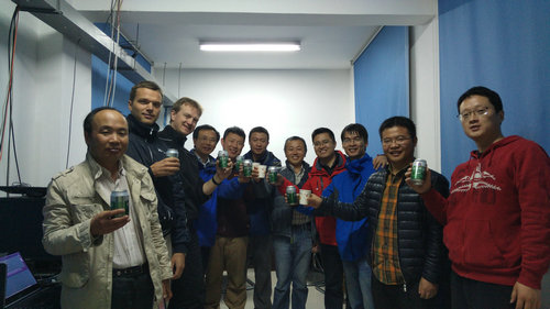 图3.SONG项目组全体在站人员在获取第一批恒星时序后在简陋的控制室中举行了一个仪式,庆祝初光。