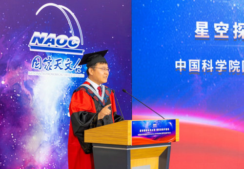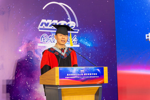 国台研究员李菂教授作为导师代表发言。李菂教授从自己过往的经历出发,教育同学们牢记仰望身边的榜样,不断学习和进步,谨记理想的重要性,让理想贯穿生活之中,使宇宙变得更有趣。博士毕业生代表王维扬以及本科毕业生代表陈智威发言,他们回顾了在母校的学习生活,感谢老师的细心指导,为他们在科研道路上打下了坚实的基础,也让他们更加深刻的体会到”博学笃志,格物明德“校训的中所蕴含的科学家精神。