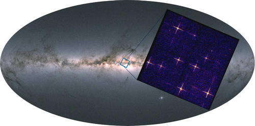 图1:宽视场X射线望远镜模块对银河系中心天区单次观测获得的X射线图像(视场18.6度x18.6度)。背景为Gaia的光学全天图像(银河系Gaia图片来自https://www.sci.news/astronomy/gaia-second-release-05950.html)。