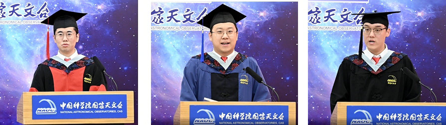 博士毕业生代表李佳东、硕士毕业生代表刘丰源和本科毕业生代表易澜洋同学依次发表了毕业感言。他们回顾了在国科大和国台几年学习生涯的宝贵经历,分享了同学之间、师生之间的友谊和情谊,更多的是感谢国台为大家提供的一流的科研平台、良好的科研环境、融洽的学习氛围,以及导师们对同学们的悉心培养,这些对于大家今后的发展是一笔宝贵的财富。正如刘丰源同学所说:“在国家天文台学习的日子里,我感受到三种精神气质,是虚怀若谷的科学胸怀、面对困难的毅力与勇气、责任感与家国情怀,这三种气质,是星空的情怀、宇宙的气魄,是这几年间,无数师长以身作则传授给我们的,无论我们未来在哪里、做什么,国台教给我们的这些品格,都必将伴随我们一生。”也正如李佳东同学所说:“无论未来我们身处什么样的工作、生活遇到何种难题,我们对知识的追求和对未知的好奇心都是珍贵且难得的初心。我希望我们能像我们的老师和前辈们一样,永远年轻、永远热泪盈眶!”