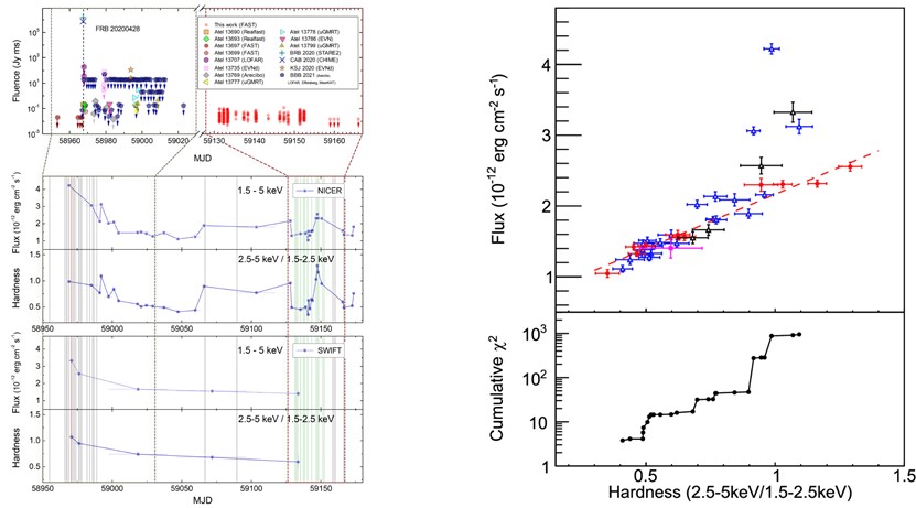 磁星软伽马射线暴源SGR J1935+2154多波段流量监测(左图),X射线硬度比具有射电辐射活跃性关联的双分支模式(右图)