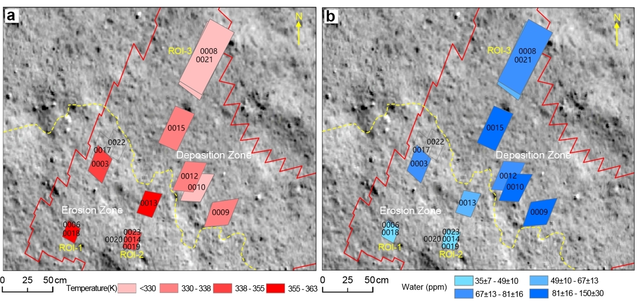 图2:嫦娥六号就位光谱数据反演的月表温度和水含量分布特征