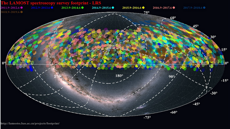 近代天文观测研究发现宇宙在不断地膨胀,而且处于加速膨胀状态。驱动宇宙膨胀的力量被天文学家称为暗能量。暗能量至今还是一个谜团,它占宇宙组成约68%,剩余物质为暗物质和普通重子物质。通过对宇宙中大量星系的光谱观测,人们能够准确获得星系的退行速度,也就是红移,从而获得天体的距离。大规模星系的红移测量能够准确刻画出宇宙物质的三维分布,精确勾勒出暗能量对宇宙膨胀的影响。