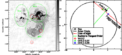 左图:W51复合体的1420 MHz连续谱图像。W51 A, B 和 C分别由绿色的三个椭圆标出。图上的4个红圈是提取吸收谱的区域。右图:超新星遗迹W51C,HII区G49.1-0.38和G49.2-0.35的位置关系。高速中性氢云可能的位置范围由黑色箭头表示。
