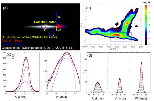 图(a):空间速度的定义(U, V, W)及LAMOST反银心方向巡天第一版增值星表中恒星在银河系中的空间分布;