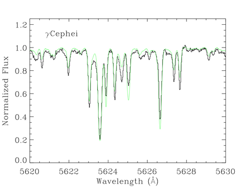 图1.Gamma Cephei的一段光谱。曝光时间120秒,R=80,000。S/N=140,视向速度精度约为3米/秒。叠加的绿色实线是Arcturus的高分辨标准光谱。