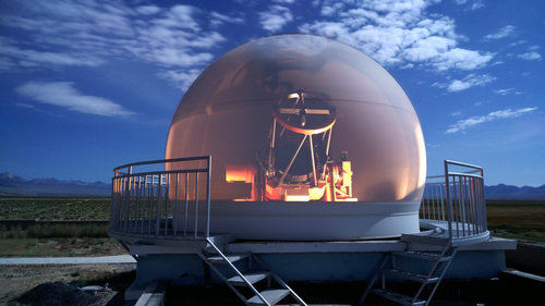 中国SONG项目包括一米望远镜(图2,在初光后为望远镜拍摄的一副照片,在内部打光后转动圆顶,用Nubia Z9长曝光模式拍摄)及其附属的幸运成像系统和高分辨光谱仪,以及前期进入科学运行的50BiN网络中国节点望远镜(项目由西华师范大学全额投资,又名西华师大50厘米双筒望远镜)。SONG1米望远镜及终端仪器研制任务由国家天文台南京天文光学技术研究所承担。该系统集成了薄镜面主动光学、幸运成像、碘盒定标高分辨视向速度测量(R=60000-120000,RV=1m/s)等一系列新技术手段。此套设备将服务于恒星物理研究中两个主要的科学目标:(1)基于幸运成像技术的微引力透镜方法探测系外行星;(2)基于视向速度的星震学方法研究恒星内部结构。这是当前时域天文学的两个典型科学目标,其科学成果依赖于网络的建设。中国SONG项目是国际网络的一个节点,也是成功实现科学运行的第二个节点。中国节点的成功,意味着国际SONG计划继去年10月丹麦的SONG-Hertzsprung望远镜进入单节点运行之后,可以进入正式的网络化运行。这是实现整个网络科学目标极其重要的一个环节。在实现初光后,在站的全体工作人员,包括来自丹麦奥胡斯大学的Frank Grundahl和MadsAndersen进行了一个简单的仪式,以庆祝这个值得纪念的时刻(图3)。