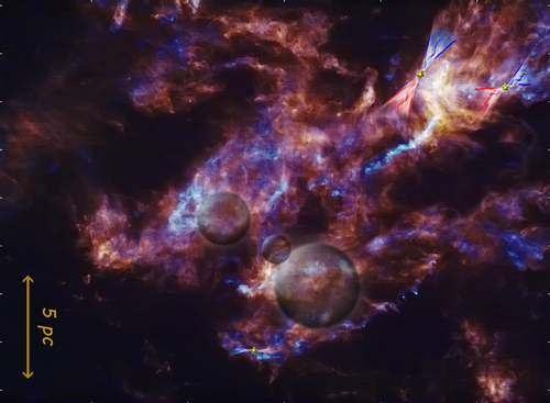 金牛座分子外向流和分子气泡示意图。背景是FCRAO望远镜观测的12CO和13CO积分强度图。蓝色和红色喷流表示外向流,透明球代表气泡。