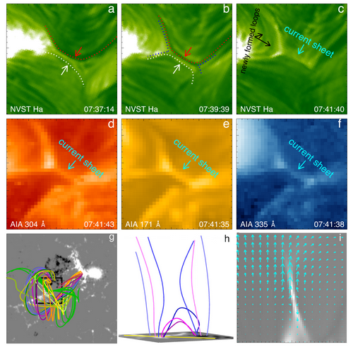 图a,b中红色和白色箭头分别代表暗条细丝和色球纤维,它们之间发生磁重联形成电流片如图c-f所示。MHD数值模拟重现了暗条爆发过程中磁重联的产生如图g-i所示。