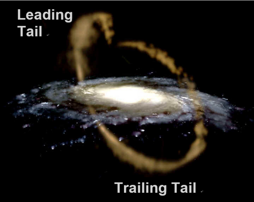 图为人马座星流被银河系吸积的示意图。这一过程在银河系中留下了显著的遗迹。图片来源: David Martinez-Delgado (MPIA) & Gabriel Perez (IAC)。