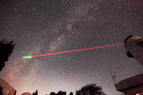 2016827日,兴隆地面站星地对接再次验证(红色光为望远镜发射地面信标光,绿色光为星载窄信标光)