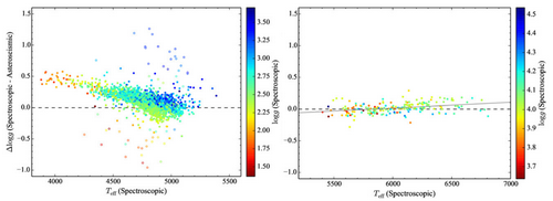 光谱学表面重力(logg)与星震学得到的logg的差异(纵轴)与有效温度(横轴)的关系,可见清晰的关系。左为巨星,右为矮星。