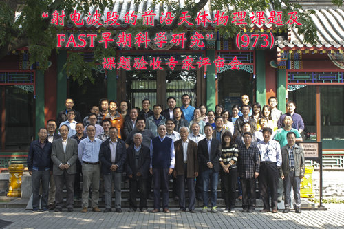 验收会议围绕FAST 973项目的六个课题,分别在脉冲星射电观测与理论研究、星际介质及恒星形成的射电研究、星系结构与星系演化、宇宙学和暗物质、射电光谱和脉泽源、低频多波束接收机和VLBI的设计预研等方向对项目执行五年来取得的成果进行汇报并与会专家进行了讨论。FAST 973项目课题验收专家组由项目首席科学家李菂研究员任组长,会同科技部领域咨询组责任专家,项目学术顾问,项目外同行专家,以及项目依托部门的管理专家共13名学者组成。