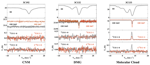 三张典型星际介质的谱线集。左:冷原子气体 中:暗气体 右:分子气体。暗气体的特征是有原子和分子的类星体吸收,没有一氧化碳发射。