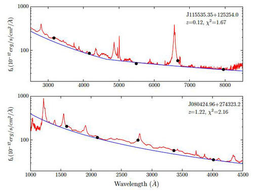 两个LAMOST类星体光谱(红色)和SDSS测光数据(黑色)的比较。蓝色曲线是拟合的连续谱。