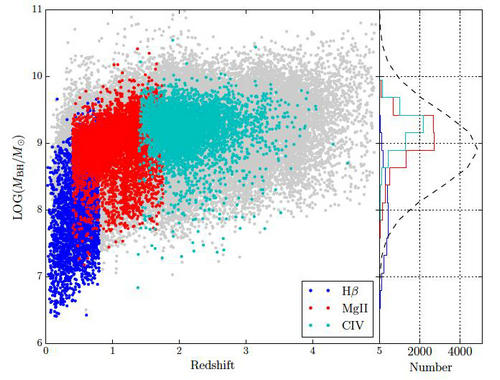 LAMOST类星体的红移和黑洞质量分布及与SDSS类星体(灰色点)的比较。深蓝色、红色和浅蓝色分别代表用氢(Hβ)、镁(MgII)和碳(CIV)发射线得到的黑洞质量。