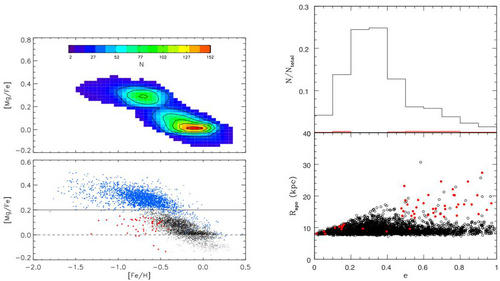 左图样本恒星[Mg/Fe]-[Fe/H]分布,蓝色圆点代表普通厚盘恒星,红色圆点代表厚盘中的低镁恒星。右图为样本中厚盘恒星轨道的极大银心距-偏心率分布,红色圆点代表厚盘中的低镁恒星。