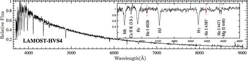 图1:新发现的超高速星LAMOST-HVS4的光谱图。局部放大的子图中展示了B型星光谱中的HeI和MgII线。