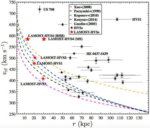 图2:速度vs距离图。图中五条彩色的虚线展示了五种引力势能模型下不同距离处的逃逸速度;红色五角星给出了LAMOST发现的四颗早型星的距离和速度(分别展示了LAMOST-HVS4为主序和BHB时的位置);黑色的五角星展示了前人发现的超高速星的速度和距离。