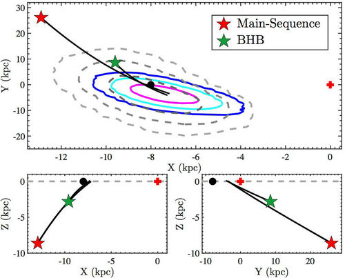 图3:新发现的超高速星LAMOST-HVS4的轨道及在银盘上可能的诞生区域。三幅图中红色和绿色五角星分别代表它为主序星和BHB星时的位置;黑色的曲线代表它的轨道;黑色实心原点代表太阳的位置,红色十字代表银心的位置;上面图中三个彩色实线分别代表它为主序星时在1σ、2σ和3σ置信度下在银盘上可能的诞生区域,灰色的虚线分别代表它为BHB星时不同置信度下在银盘上的诞生区域。