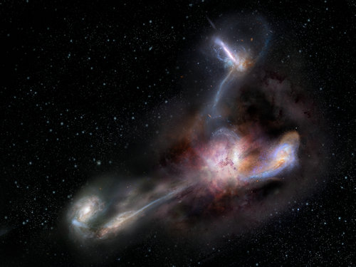 W2246-0526的想象图:已知最明亮的星系W2246-0526正在吞食三个伴星系。(图片来源:NRAO/AUI/NSF, S. Dagnello)