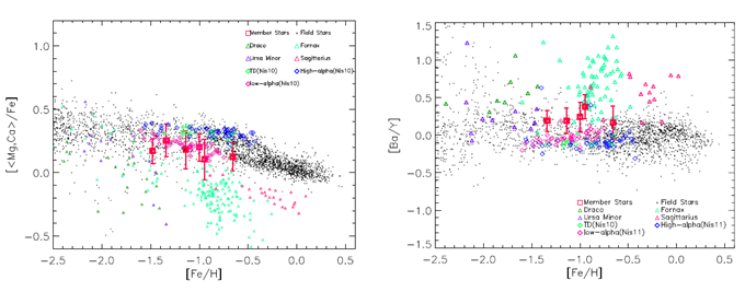 该研究成果发现这个星流成员星的[α/Fe]比相同金属丰度的银河系场星平均低0.1dex(图1左),和Nissen的低α晕星(图1中的紫色棱形,被认为来自于银河系对矮星系的吸积)分布较一致。[Ba/Y]比银河系场星高0.2dex(图1右),Cr丰度比银河系场星偏低约0.15dex。