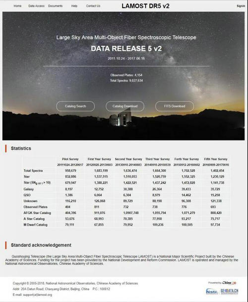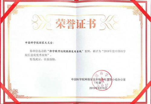 近日,郭守敬望远镜(LAMOST)数据发布系统被评为“2018年度中国科学院信息化优秀案例”。截至2019年4月,LAMOST数据发布系统已为科学用户提供了100多万次检索服务、近60TB的数据下载量,产出近400篇科学论文。