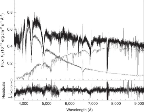 该白矮星+冷亚矮星双星的光学光谱。上图中黑色实线显示的是X-Shooter/VLT拍摄的光学光谱:在蓝端可以看到明显的DA型白矮星特征——氢巴尔末吸收线;红端可以看到冷亚矮星的特征——在6800埃附近有宽的CaH分子带。上图中黑色虚线显示的是最佳拟合的两子星(白矮星和冷亚矮星)的模板谱。下图显示的是拟合残差。