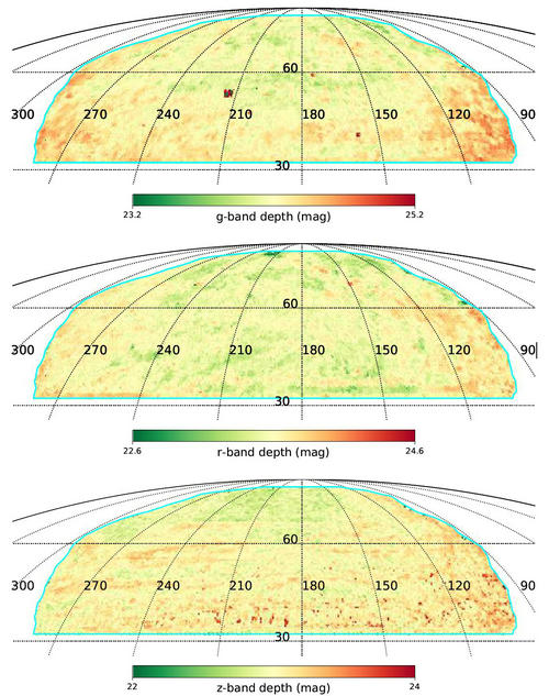 图2. BASS巡天DR3版本数据主巡天区域的深度分布图。深度为5σ点源对应的极限星等。