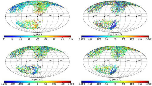 为了寻找这些子结构,研究人员利用LAMOST DR5中K巨星的空间位置和视向速度,再结合匹配自Gaia DR2的切向速度信息,得到13,000余颗具有完整六维相空间信息的晕星星表,同时这也是目前能够得到的拥有完整六维信息的最大银河系晕星星表(如图1所示)。