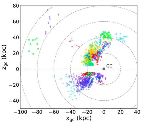研究人员在对样本中具有相似速度和位置的恒星进行归类和分组后,在13,000颗晕星样本中找到了40余组,近2,000颗晕星是属于子结构的(见图2),这些恒星具有明显区别于本地晕星的成团性(位置和速度空间)。此外,还找到了18组,300余颗很可能是首次被发现的新的子结构。