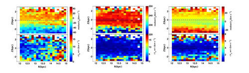 图一:银河系盘在12-15kpc范围内的非对称速度分布,上面三张图是径向、轴向、垂向的速度分布,下面三张图是误差分析。上图颜色不同即可代表非对称性。