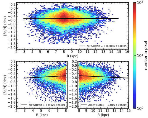 通过对LAMOST和Gaia数据中筛选出的307,246颗巨星样本进行研究分析,闫业鹏和杜翠花等人发现薄盘星的金属丰度分布是一个均值为-0.2的高斯分布,而厚盘星的金属丰度分布并不符合高斯分布,它存在一个贫金属的尾巴。进一步研究表明厚盘的金属丰度随着径向距离的变化整体展现了一个几乎为零的梯度,而内盘存在一个小的正梯度,外盘存在一个小的负梯度。同时,薄盘的金属丰度随着径向距离的变化也展示了类似的特征。