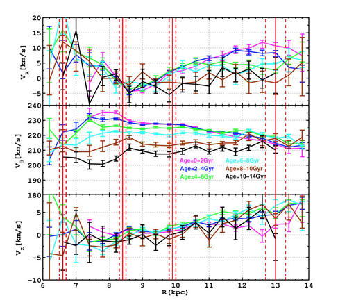 近期,LAMOST特聘青年研究员、云南大学王海峰博士后和云南大学黄样、陈丙秋副教授,国家天文台邓李才研究员,与美国及西班牙研究团队合作,基于LAMOST巡天数据,在6-14kpc的银河系盘区域上,不仅肯定了王海峰等人(Wang et al, 2018b, MNRAS, 478, 3367; Wang et al., 2018a, MNRAS, 477, 2858)之前在数密度和速度空间上探测到的“北近结构(North near)”,还为该子结构刻上了时间演化序列,发现该结构是一个相对年轻、化学丰度较贫、金属丰度较富、“存活时标”大致是60亿年的结构。更有趣的是,王海峰等人还对该子结构进行了详细地动力学分析与量化,他们认为该结构对应的盘面非对称物理机制目前很难给出一个非常精准的结论,但可推测该结构不太可能是银河系的棒、外盘的椭圆性分布、盘的长期膨胀或者星流的动力学效应所导致的,其他物理机制如旋臂的动力学、外盘的非平衡态破损、矮星系的次并合极有可能起着非常显著的作用。同时该工作还细致描绘了盘上径向速度梯度变化的星族结构。