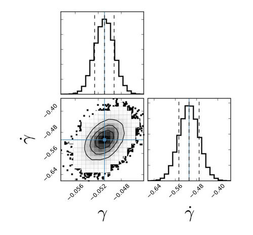 上图表示的是银河系三维非对称速度沿着径向距离的分布,可以看到有很多梯度分布,不同的颜色代表不同的年龄星族,垂直的红色实/虚线代表银河系的四条旋臂位置。下图表示文中利用一个简化模型对银河系翘曲强度以及强度变化参数的模特卡罗拟。