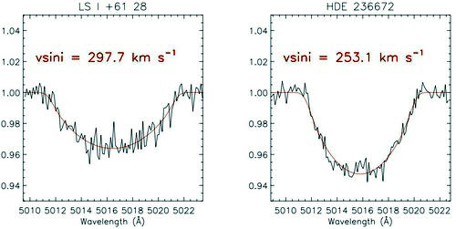 这两颗星分别被称为:LS I +61 28 和 HDE 236672。LS I +61 28是迄今为止,唯一一颗高速自转的ON矮星;而HDE 236672是目前发现的第三颗高速自转的ON亚巨星。从它们对应的LAMOST中分辨率光谱中,我们得到其自转速度分别为298 km/s和253 km/s(见图1)。