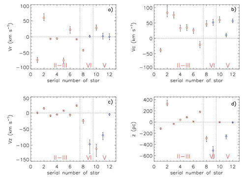 ON星在本地的相对运动和银道面高度(巨星:II-III; 亚巨星: VI; 矮星:V)