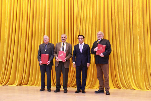 1月16日上午,中国科学院2020年工作会议在中国科学院大学雁栖湖校区召开。会上,中国科学院副院长张亚平宣读了2019年度中国科学院国际科技合作奖获奖名单和表彰决定,国家天文台推荐的Richard Gordon Strom教授、中国科学院大学推荐的Sokrates Theodore Pantelides教授和沈阳生态所推荐的Ewald Schnug教授获奖,三家推荐单位同时得到表彰。中国科学院院长白春礼为Richard Gordon Strom等专家颁发奖章和证书,并合影留念。颁奖典礼之后,国际合作局局长李寅接见了三位获奖专家并亲切交谈。白春礼院长、张亚平副院长专门设午宴款待三位专家及其配偶,推荐单位的领导陪同,国家天文台党委书记赵刚出席。宴会上白春礼和Richard Gordon Strom谈论了新石器天文,气氛热烈。