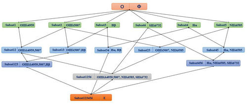 SVM-LATTICE框架示意图:图中每个结点都部署一个分类器,对应一个特征空间集,结点间构成一个双峰轮廓的置信Grid,纵向上较低的层次拥有较高的置信度,由高到低满足置信阈值可以实现搜寻短路;横向上反映不同的特征类别,有利于区分可能的特征激发机制。此外,层次间结点体现了特征在统计上的泛化-例化关系。
