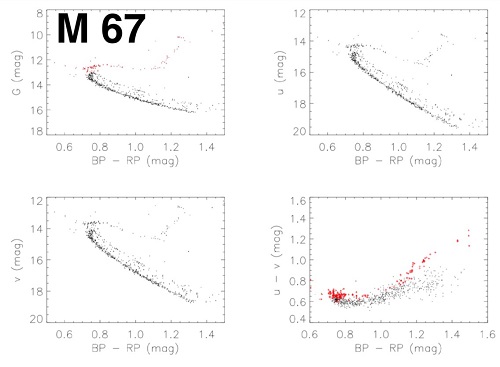 图4.疏散星团M67的颜色-星等/颜色图,横坐标是Gaia的测光颜色,纵坐标:左上为Gaia的数据,其它三幅为SAGE巡天测光数据。可以看出SAGE测光最终的测光和定标精度和Gaia几乎相当。红色为巨星,黑色为矮星,可以看出uSC-vSAGE颜色可以很好的区分巨星和矮星。
