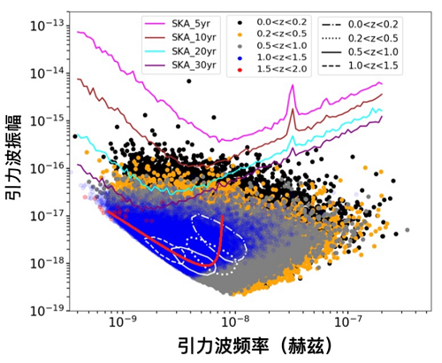 不同颜色的点代表不同红移的超大质量双黑洞,不同颜色的线代表SKA运行一段时间探测引力波的阈值,点在线之上代表能探测到该引力波源。