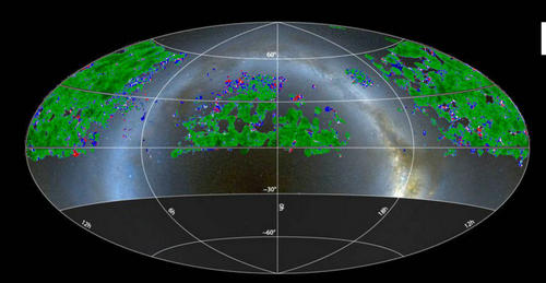 LEGAS巡天项目中LAMOST星系在天空中的分布(RA,DEC)。红色表示LAMOST观测中被标记为星系的所有的源,蓝色表示具有高质量光谱数据的源,而绿色表示在此项工作中已经获得速度弥散的星系。