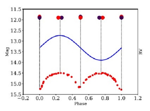 图1:双星的掩食过程展示。最上的两个圆圈表示两个恒星成分。中间的曲线表示可观测恒星的径向速度曲线。下面的曲线是光谱、掩食双星系统LPSEB71的光变曲线。所示的RV曲线对应于用深色圆圈标记的恒星。